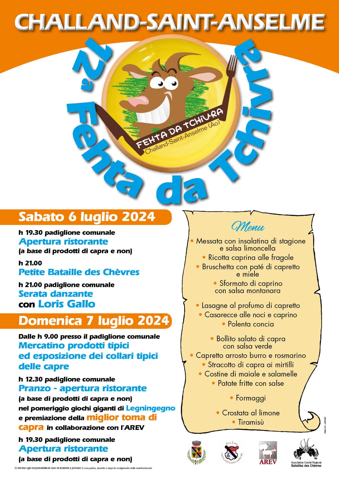 Presso padiglione comunale domenica mattina dalle ore 9:00 (nove) mercatino prodotti tipici ed esposizione dei collari tipici delle capre, alle ore 12:30 (dodici e trenta) pranzo con prodotti di capra e non e nel pomeriggio giochi giganti di Legningegno e premiazione della miglior toma di capra in collaborazione con Arev alle ore 19:30 (diciannove e trenta) cena presso padiglione comunale a base di prodotti di capra e non.