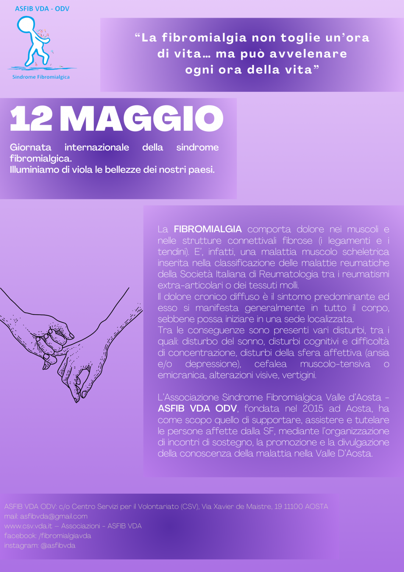 L'Associazione Sindrome Fibromialgica Valle d'Aosta promuove una serie di attività per sensibilizzare l'opinione pubblica sulle condizioni del paziente fibromialgico