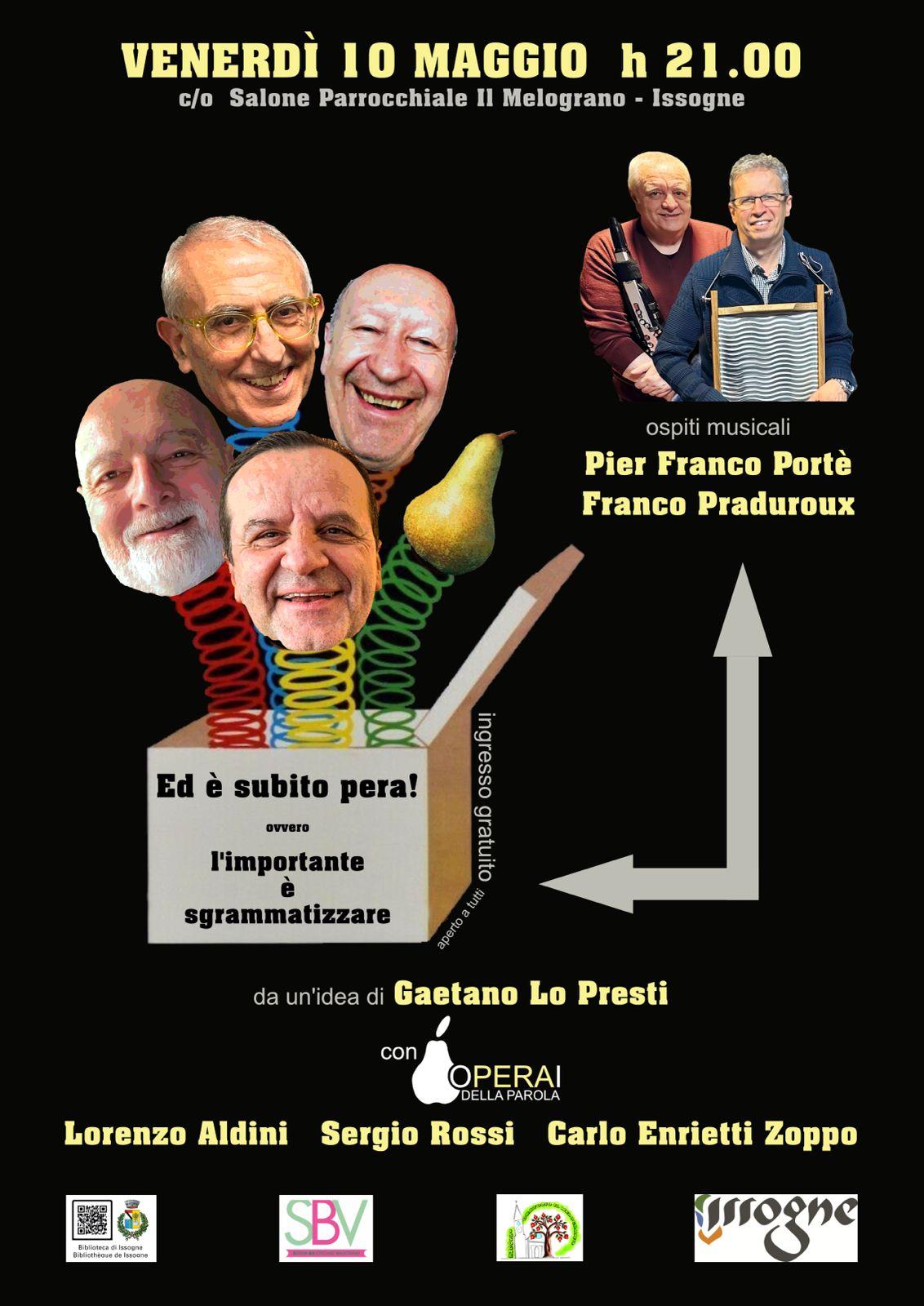 Venerdì 10 maggio alle ore 21.00 presso il Salone il Melograno di Issogne si terrà lo spettacolo "Ed è subito pera"!