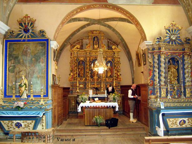 La cappella è di due epoche ben distinte: il presbiterio, con la sua volta e i costoloni, può assegnarsi alla fine del secolo XV - all’epoca del grande mecenate Giorgio di Challant, ed in effetti lo stemma dei Challant che si vede nella chiave di volta lascia supporre che questa famiglia abbia contribuito alla costruzione della cappella - mentre la navata è del secolo XVIII. La cappella è intitolata alla visitazione della Madonna. L’altare maggiore è in legno intagliato, dipinto e in parte dorato. Tra quattro colonne tortili si trovano al centro la statua della Madonna col Bambino, sulla sinistra S. Paolo, a destra Santa Barbara. In alto, nella nicchia centrale, S. Pietro seduto in cattedra.