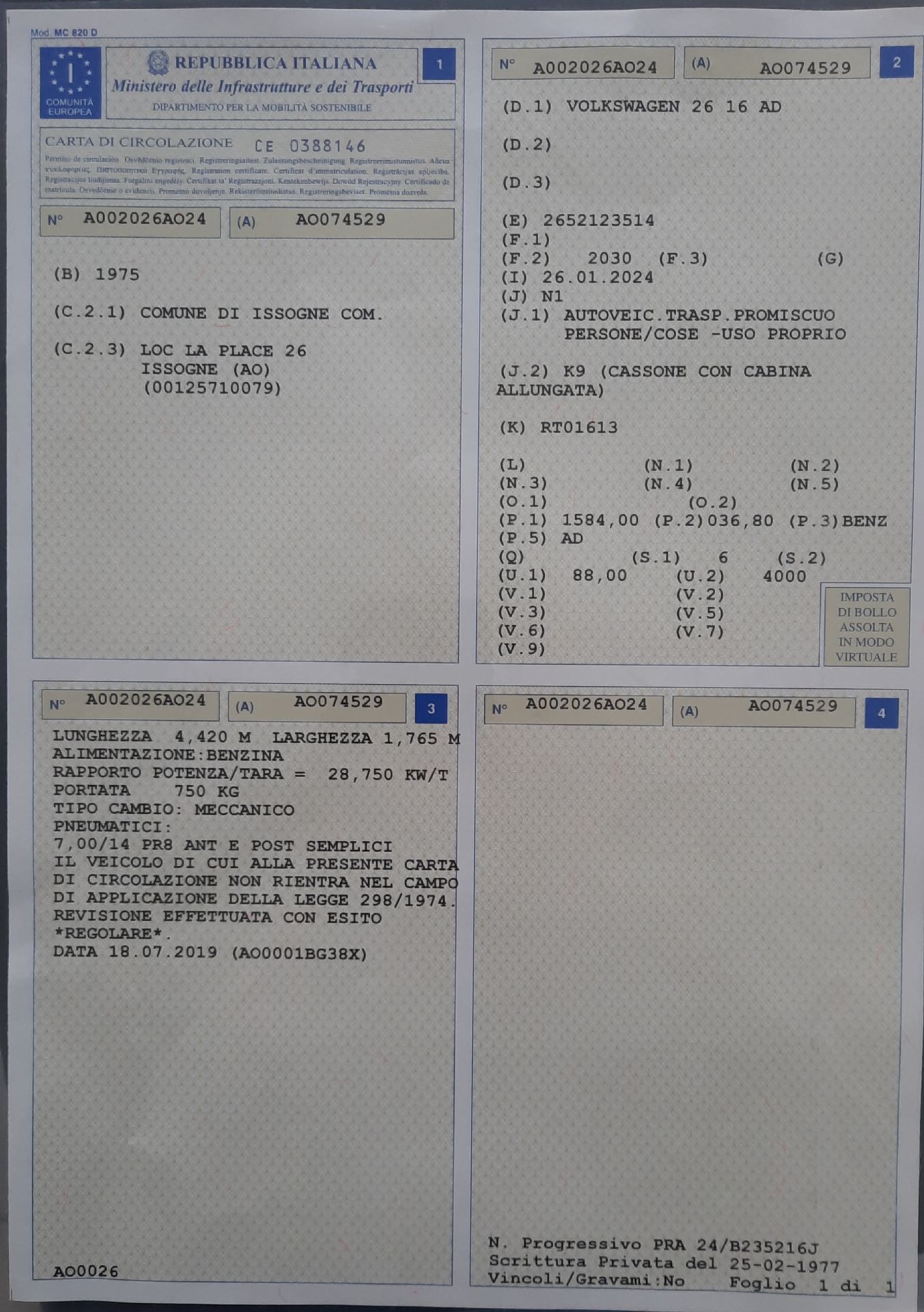 Issogne - Foto alienazione mezzo usato proprietà comunale - Volkswagen 26 16 AD - Allegato C