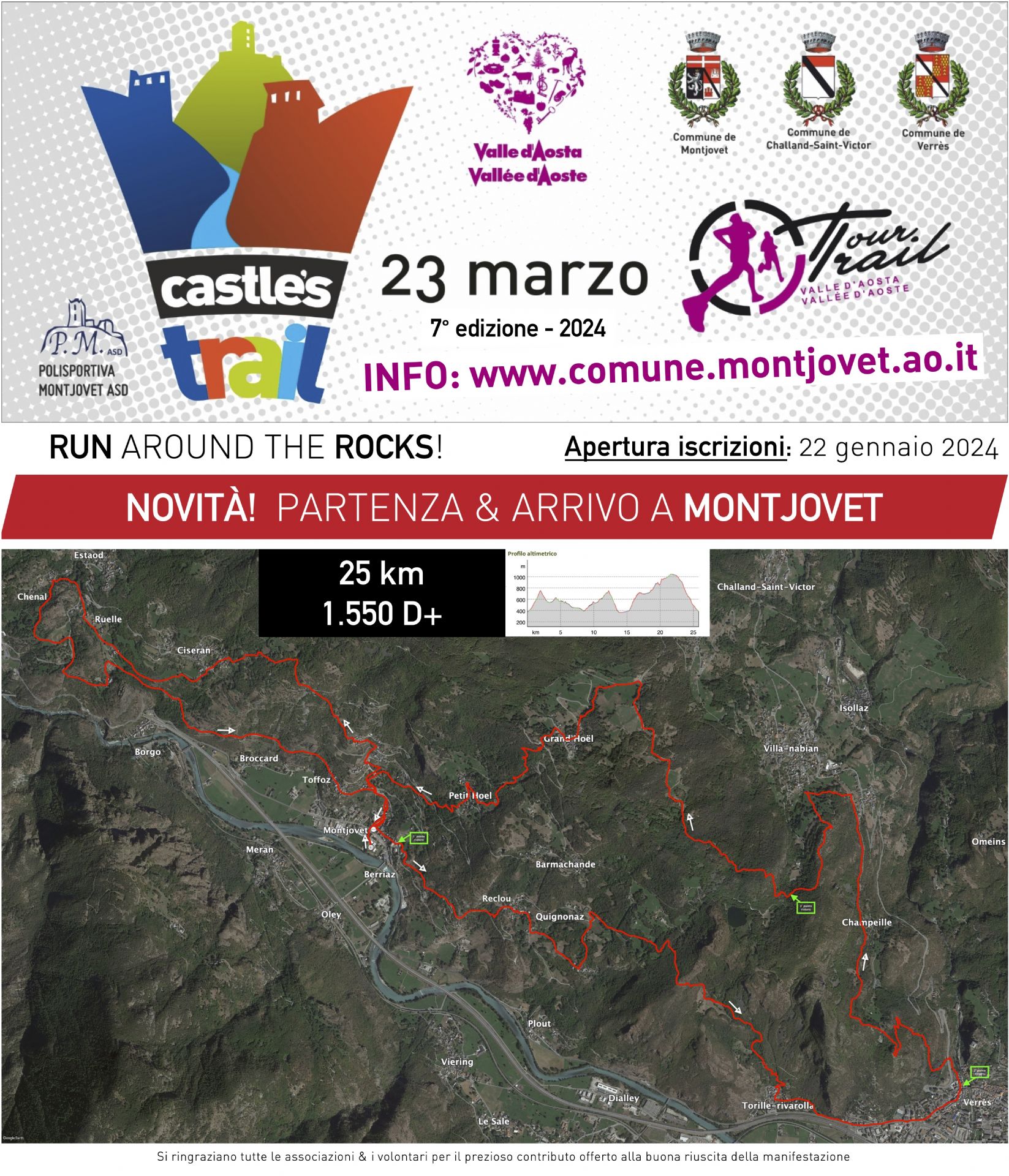 Quest’anno la settima edizione del Castle’s Trail parte dall’area sportiva di Montjovet in Frazione Berriat ed arriva alla vicina strada che porta a Frazione Le Brun.