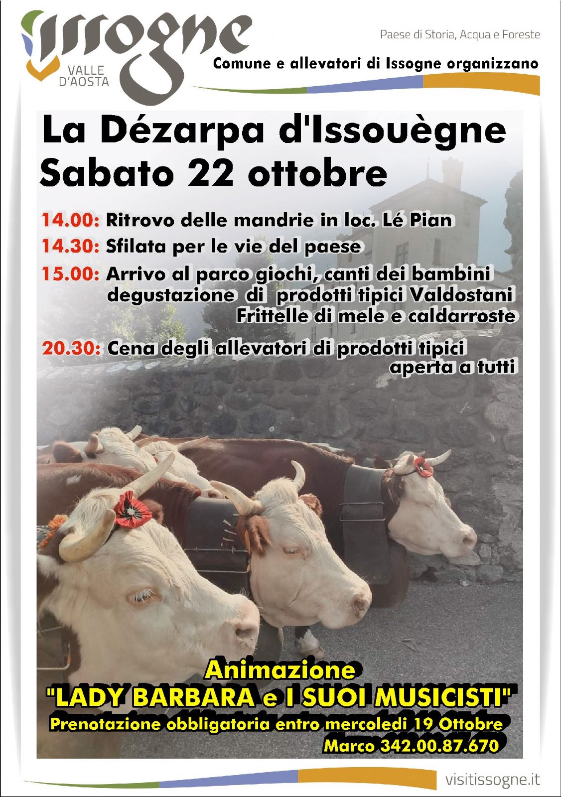 La Dézarpa d’Issouègne, organizzata con il patrocinio dell’Assessorato regionale all’Agricoltura, presenta importanti novità. In primis all’evento sono invitati tutti gli allevatori di Issogne, che potranno partecipare alla sfilata con il proprio bestiame: mucche e capre.