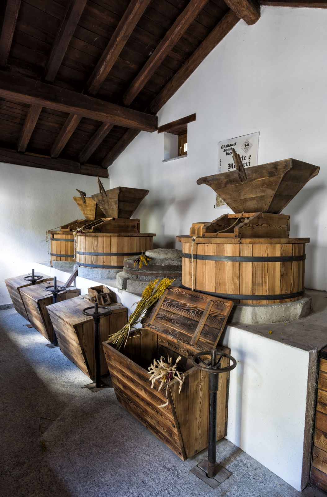 Located on the right back of the Évançon stream, this mill captures the water through a largely underground channel that leads it to the waterwheel, turning it to drive the millstones for grinding wheat and rye, and a press for crushing walnuts to extract their oil.