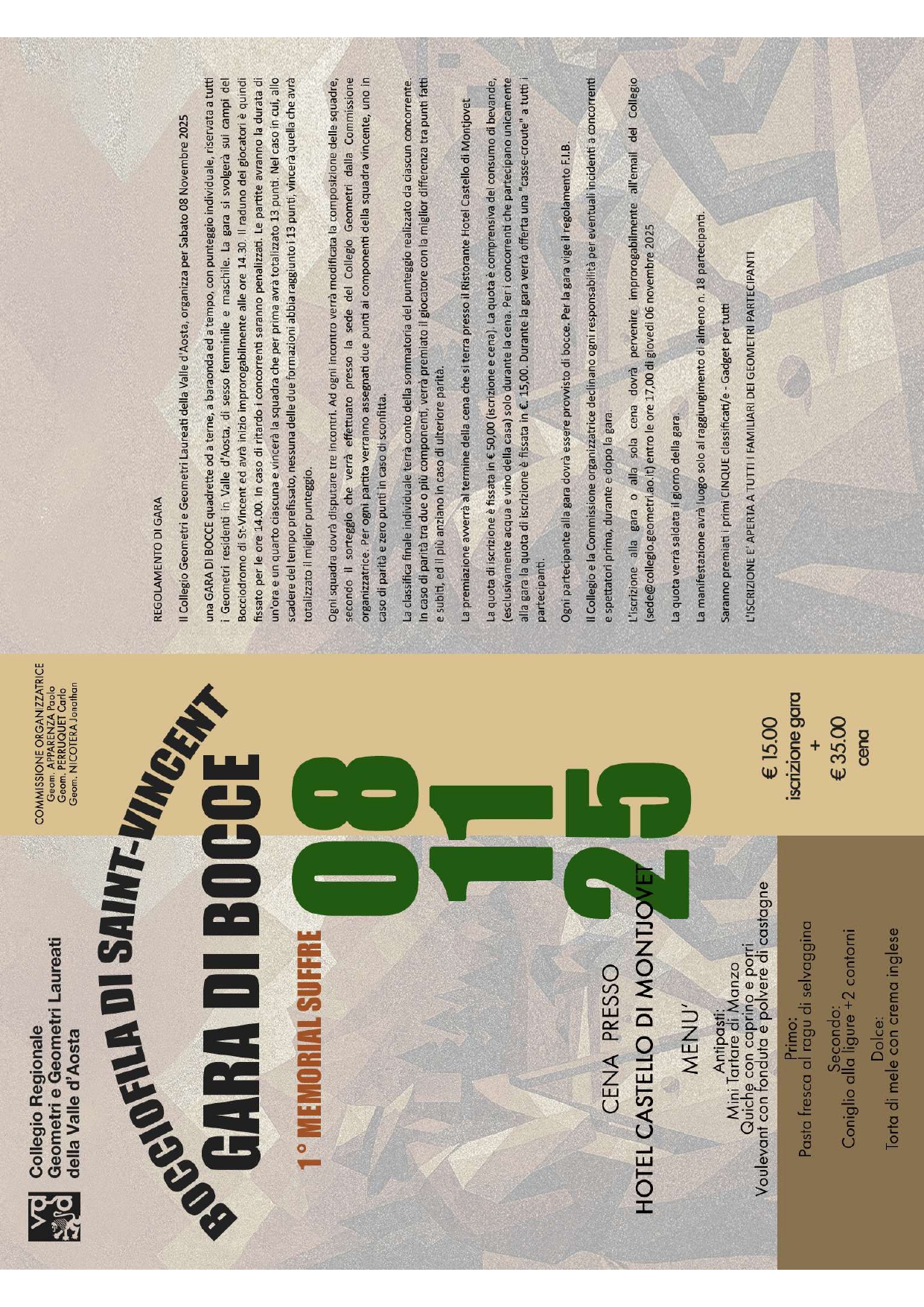 L'iscrizione alla gara o alla sola cena dovrà pervenire improrogabilmente alla mail del Collegio (sede@collegio.geometri.ao.it) entro le ore 17:00 di giovedì 06 Novembre 2025.