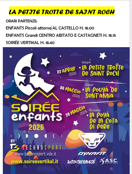 La prima gara è in programma mercoledì 22 aprile a Issogne, con la “Petite Trotte de Saint-Roch”. Si proseguirà poi il 6 maggio a Gignod con la “Pouyà de Sent’Anna”, il 20 maggio a Étroubles con la “Poyà de la Cota di Pére”, per chiudere il 10 giugno sui sentieri di Sarre con la “Coumba Perni”.3.