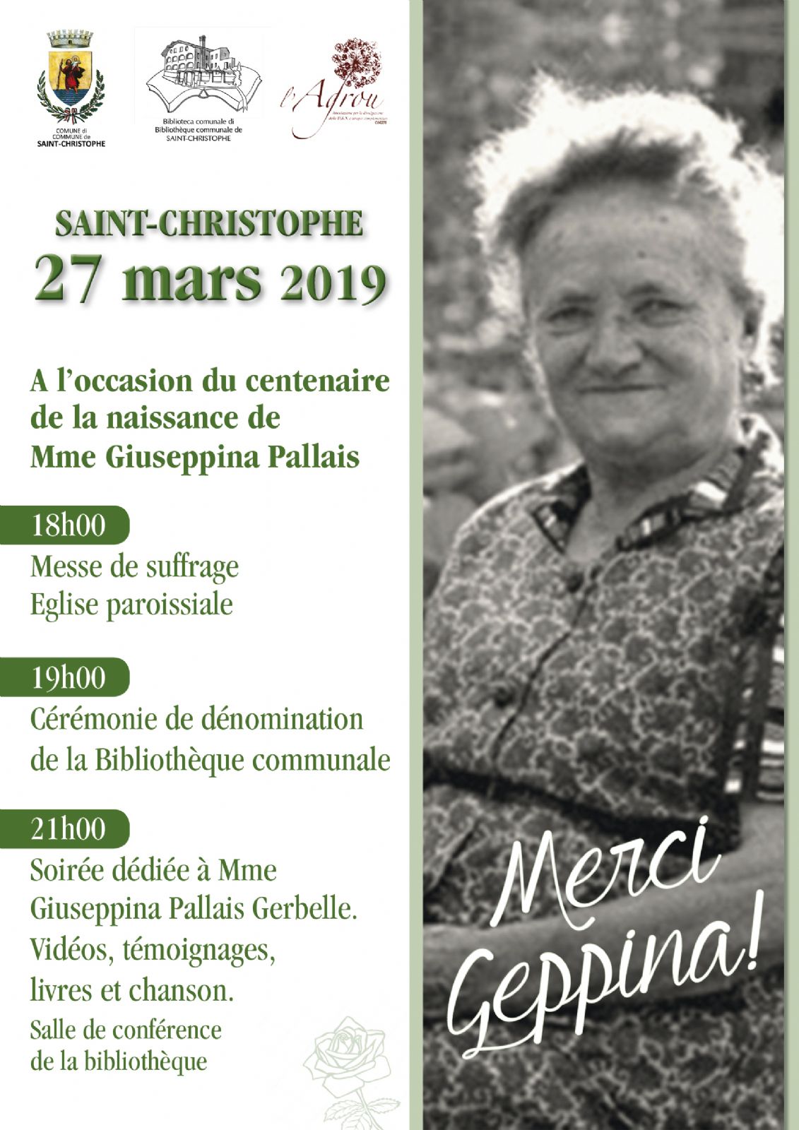 Le 27 mars 2019 à l'occasion du centenaire de la naissance de Mme Giuseppina Pallais: 18h00 Messe de suffrage, Eglise paroissiale; 19h00 Cérémonie de dénomination de la Bibliothèque communale; 21h00 Soirée dédiée à Mme Giuseppina Pallais Gerbelle, vidéos, témoignages, livres et chanson auprès de la salle de conférence de la bibliothèque.