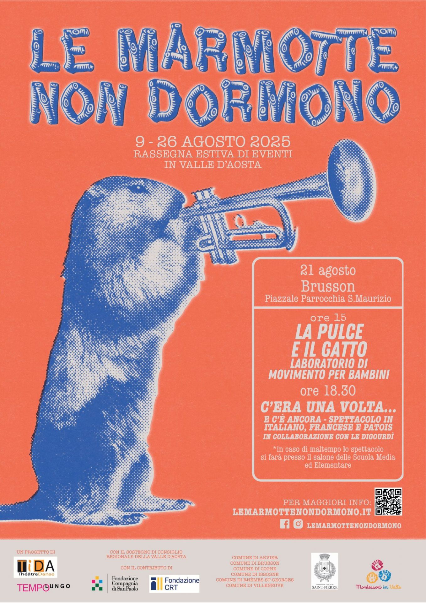AVVISO: Si comunica che, a causa delle previsioni meteo incerte, sia i laboratori sia lo spettacolo teatrale previsti per oggi giovedì 21 agosto nell'ambito della rassegna Le marmotte non dormono, si terranno presso il Salone delle scuole .