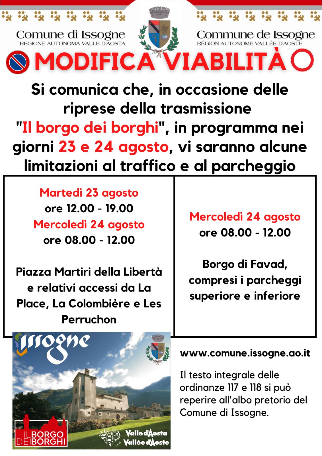 Si comunica che, in occasione delle riprese della trasmissione "Il borgo dei borghi", in programma nei giorni 23 e 24 agosto, vi saranno alcune limitazioni al traffico e al parcheggio.
